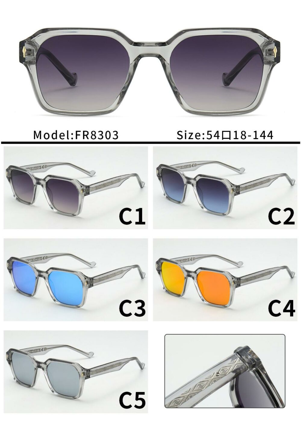 Les Lunettes solaires, référence: FR8303, allient style et protection. Leurs verres sont classés dans la catégorie 3. Profitez du confort et de l’élégance tout au long de la journée.